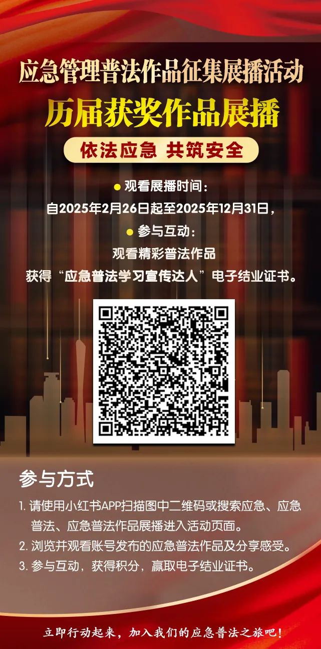 打开小红书搜索“应急普法作品展播”页面观看应急管理普法作品及分享感受,可获得积分,积满100分可获得“应急普法学习宣传达人”电子结业证书。